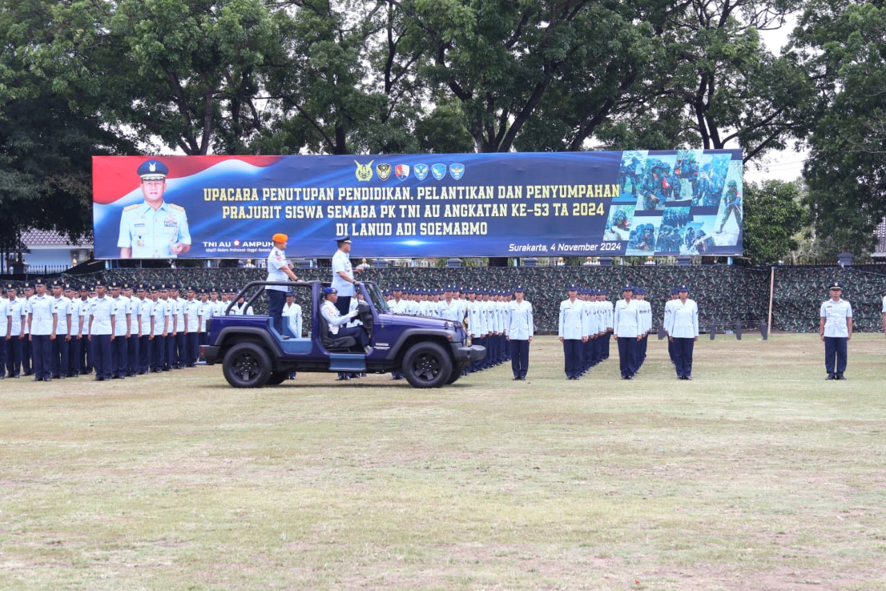 Mandala Nusantara News, Surakarta. Lanud Smo. Sebanyak 556 bintara baru lulusan Sekolah Pertama Bintara Prajurit Karier (Semaba PK) TNI AU angkatan ke-53 secara resmi dilantik oleh Komandan Kodiklatau Marsdya TNI Dr. Arif Mustofa, M.M., CGRE., pada upacara Penutupan Pendidikan, Pelantikan Dan Pengambilan Sumpah Prajurit Siswa Semaba PK TNI AU Pria dan Wanita Angkatan ke-53 yang berlangsung di lapangan Dirgantara Lanud Adi Soemarmo. Senin (4/11/2024)