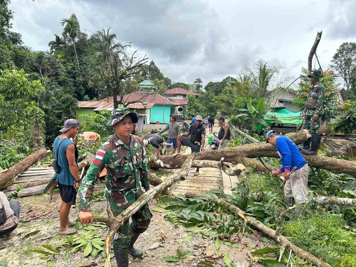 mandalanusantaranews.com Sintang – Sebagai bentuk kewaspadaan terhadap angin kencang, Satgas Pamtas RI-Malaysia Yonzipur 5/ABW, Pos Nanga Bayan bersama Warga menggelar kerja bhakti penebangan pohon di sekitar jalan permukiman di Desa Nanga Bayan, Kecamatan Ketungau Hulu, Kabupaten Sintang, Kamis (27/3/2025).