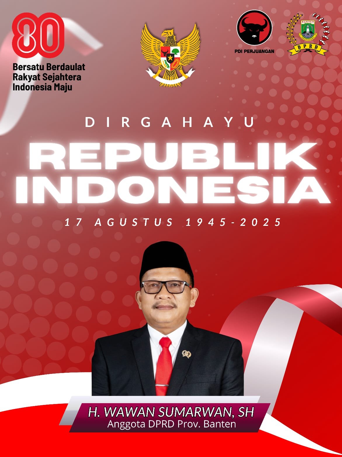 Anggota Komisi II Dewan Perwakilan Rakyat Daerah (DPRD) Provinsi Banten, 𝙃. 𝙒𝙖𝙬𝙖𝙣 𝙎𝙪𝙢𝙖𝙧𝙬𝙖𝙣,𝙎.𝙃., menyampaikan ucapan selamat Hari Ulang Tahun (HUT) Ke-80 Republik Indonesia.