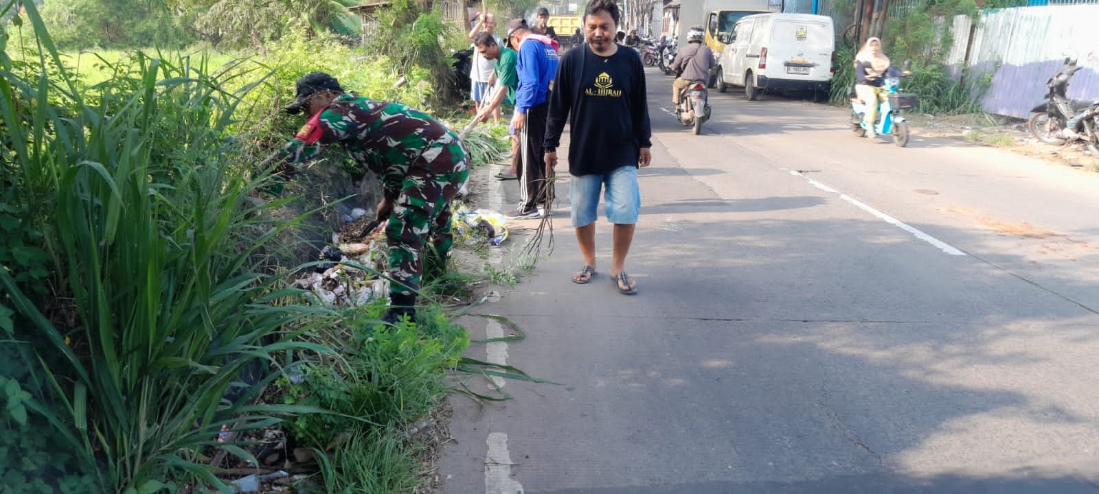 Mandala Nusantara News Kodam Jaya, Tigaraksa – Babinsa Desa Tanjakan, Koramil 12/Rajeg Kodim 0510/Trs Kopdar Abdul Kholid bersama Kades Tanjakan Saumin dan warga masyarakat melaksanakan kerja bakti membersihkan lingkungan, Jalan Raya Tanjakan Desa Tanjakan Kecamatan Rajeg, Kabupaten Tangerang, Jum’at (11/04/2025).