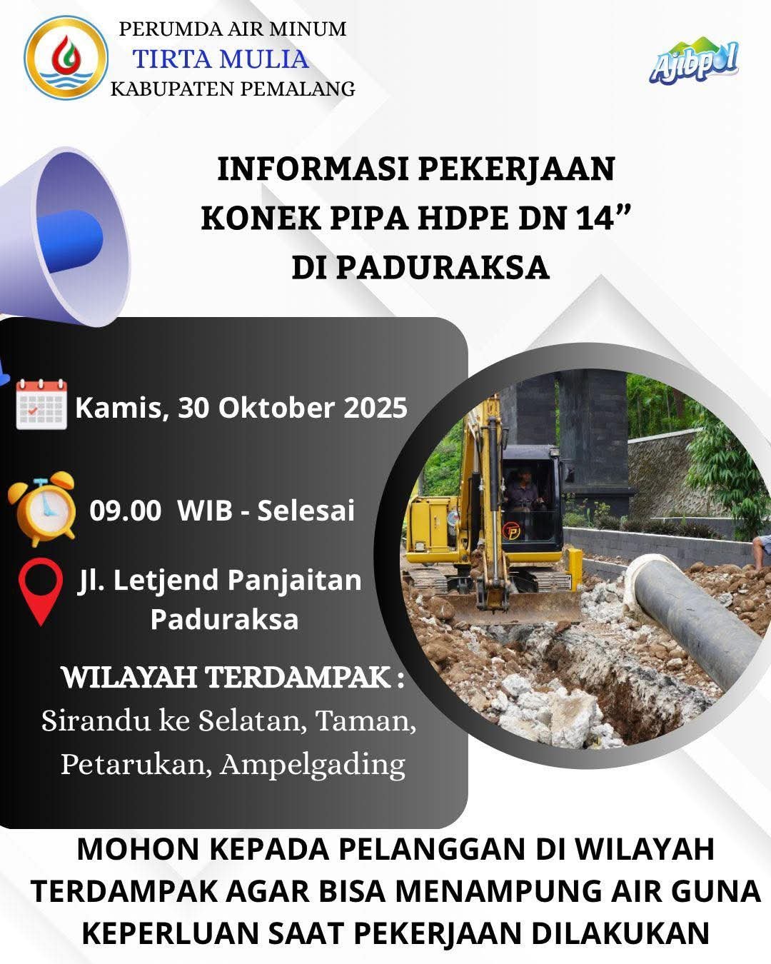 Pengerjaan dijadwalkan dimulai pada pukul 09.00 WIB hingga selesai. Pihak Perumda Tirta Mulia memohon maaf atas ketidaknyamanan yang mungkin timbul akibat pekerjaan ini.