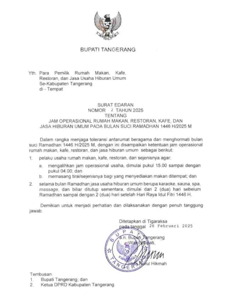 mandalanusantaranews.com Tangerang, – Dalam rangka menjaga toleransi antar umat beragama dan menghormati bulan suci Ramadhan 1446 H/2025 M, Pemerintah Kabupaten Tangerang mengeluarkan Surat Edaran Nomor 2 Tahun 2025. Surat ini mengatur jam operasional rumah makan, kafe, restoran, serta usaha hiburan umum selama bulan Ramadhan, Rabu 26/02/25.