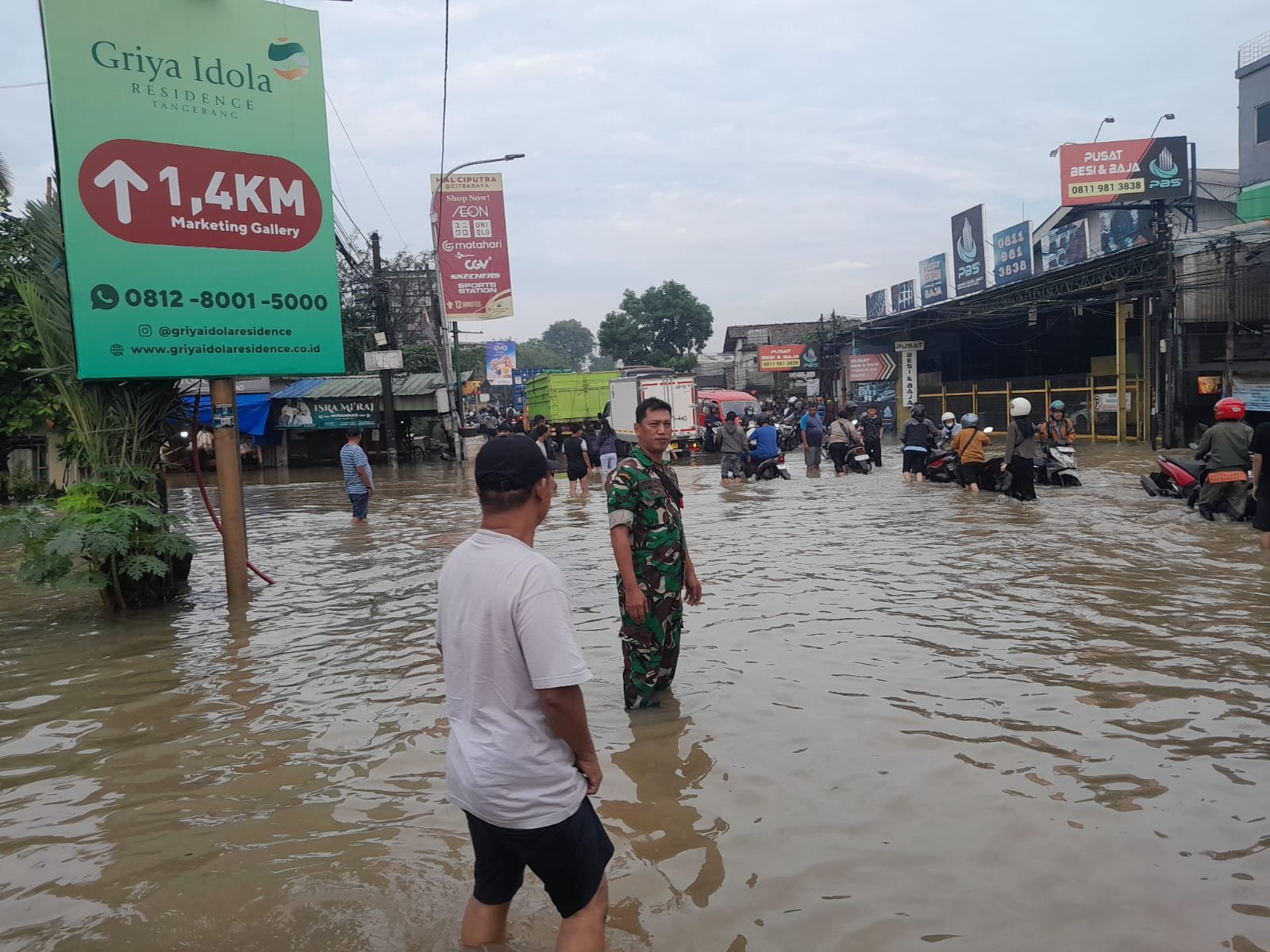 Akibat Curah hujan yang tinggi sepanjang malam sehingga air menggenangi Pemukiman dan Jalan sampai Kurang lebih kedalaman air 80 cm yang mengakibatkan lalulintas macet dari arah Cikupa sampai Bitung.