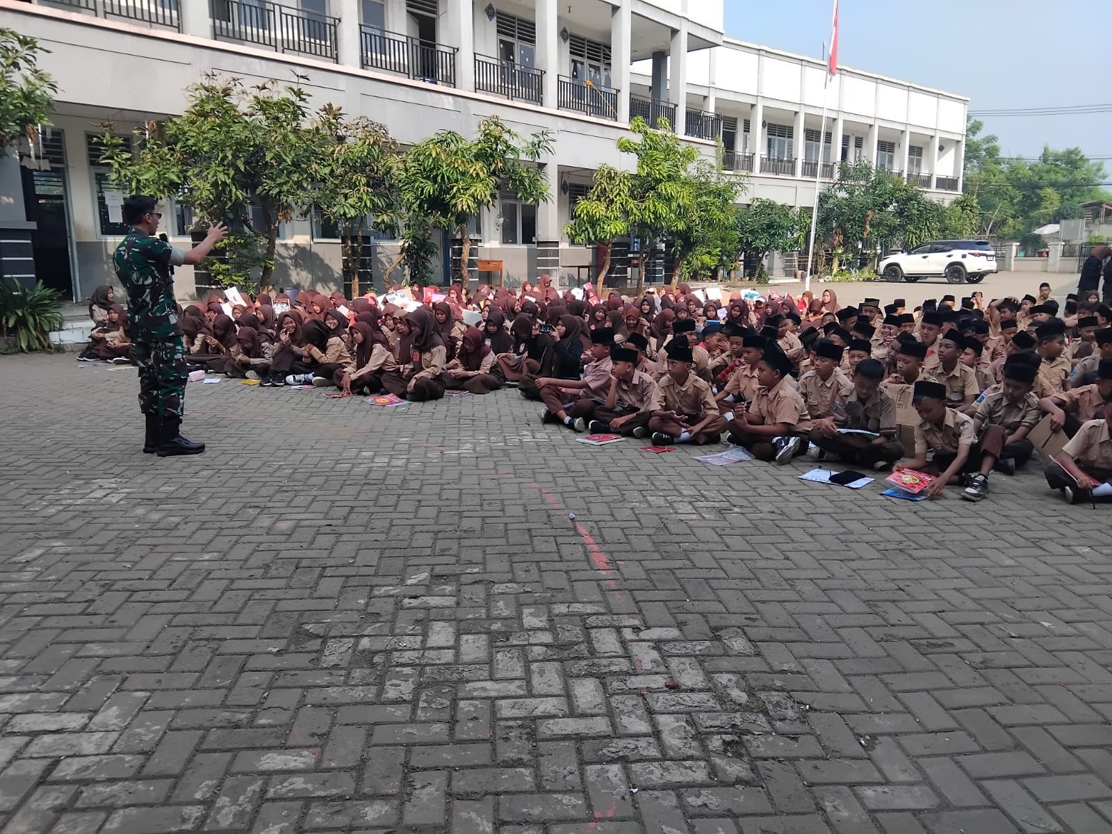 Mandala Nusantara News Kodam Jaya, Tigaraksa – Danramil 12/Rajeg, Kapten Inf Teguh Rusmadi, memberikan materi Wawasan Kebangsaan dan kedisiplinan kepada siswa baru dalam kegiatan Masa Pengenalan Lingkungan Sekolah (MPLS) di SMP Ayatra, Kampung Kukun, Kelurahan Sukatani, Kecamatan Rajeg, Rabu (16/7/2025).