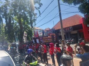 mandalanusantaranews.co.id, Surabaya – Belasan pekerja KFC yang tergabung dalam Solidaritas Perjuangan Buruh Indonesia KFC (SPBI KFC) menggelar aksi damai di depan Royal Plaza, Jalan Ahmad Yani, Kota Surabaya, Senin (5/8)