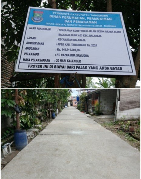 Di ketahui kegiatan tersebut berjudul Pekerjaan Kontruksi Jalan Beton Graha Hijau Balaraja Blok A03 kec. Balaraja yang di kerjakan oleh PT. Razka Dua Samudra dari APBD tahun anggaran 2024.