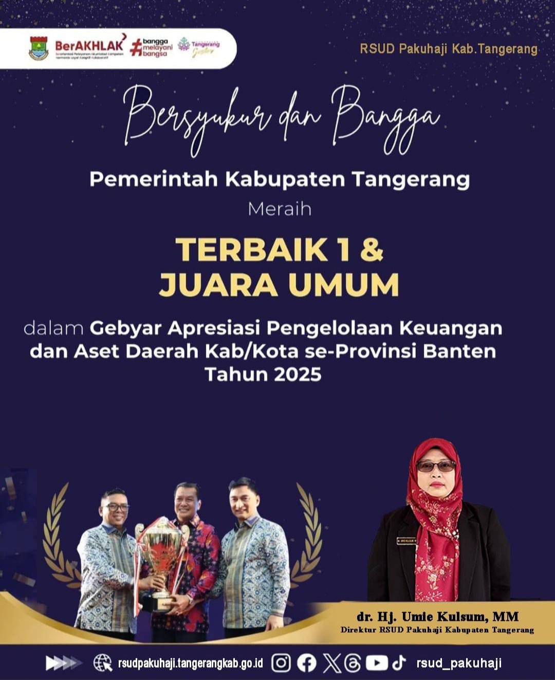 MN News Tangerang, – Direktur Rumah Sakit Umum Daerah (RSUD) Pakuhaji, dr. Hj. Umie Kulsum,MM. menyampaikan rasa Bersyukur dan Bangga kepada Bupati Tangerang, Drs. Moch. Maesyal Rasyid, M.Si, yang telah meraih Juara Umum dan Penghargaan Terbaik satu dalam Gebyar Apresiasi Pengelolaan Keuangan dan Aset Daerah