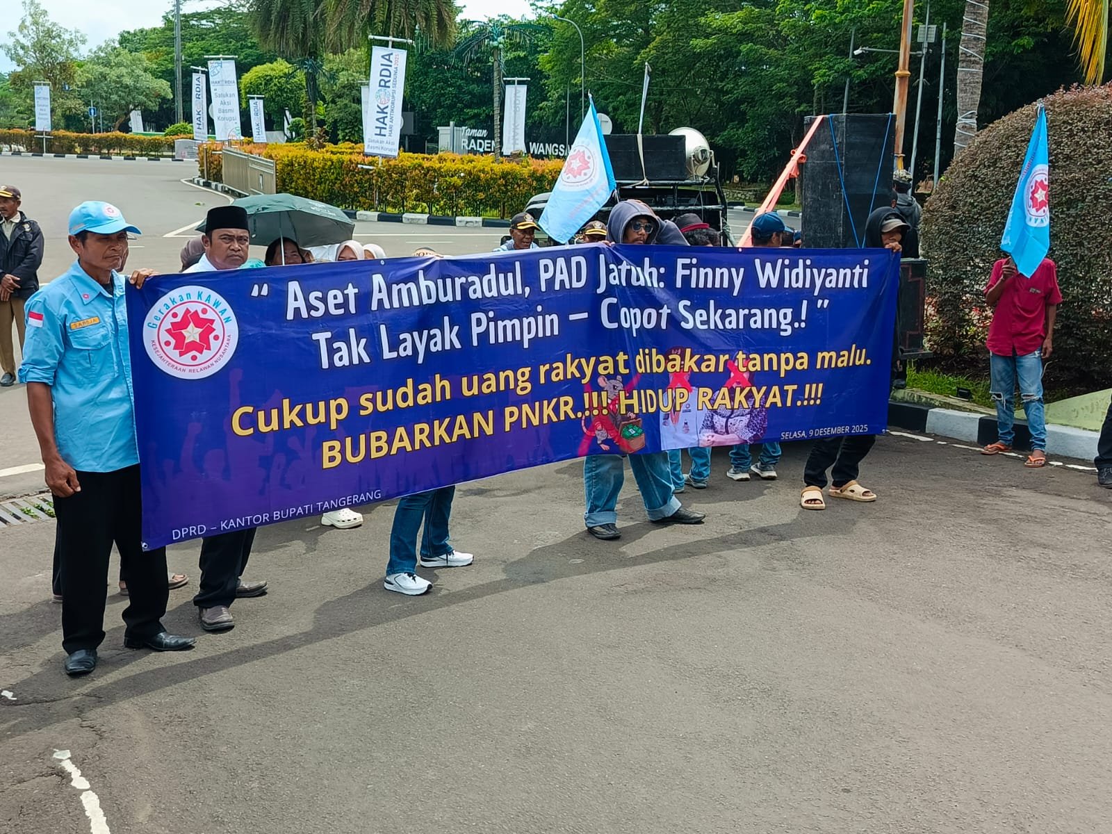 MN News Tangerang, – Bertepatan dengan Hari Anti Korupsi Sedunia (Hakordia) Gerakan (KAWAN) Kesejahteraan Relawan Nusantara menggelar aksi Demo di Kantor DPRD dan Gedung Bupati Tangerang, mereka menuntut Bupati Tangerang dan DPRD untuk segera mencopot Finny Widiyanti Dirut Perusahaan Umum Daerah (Perumda) Pasar Niaga Kerta Raharja (PNKR) Selasa 09 Desember 2025.