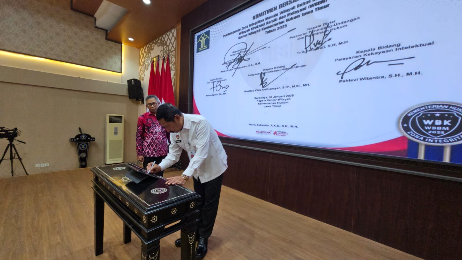 Mandala Nusantara News SURABAYA – Kantor Wilayah Kementerian Hukum Jawa Timur menggelar acara Penandatanganan Komitmen Bersama dan Penguatan Pelaksanaan Reformasi Birokrasi serta Pembangunan Zona Integritas Tahun 2025, Kamis (30/1). Kegiatan ini bertujuan untuk memperkuat komitmen dalam menciptakan pemerintahan yang bersih, transparan, akuntabel, dan berorientasi pada pelayanan publik yang prima.