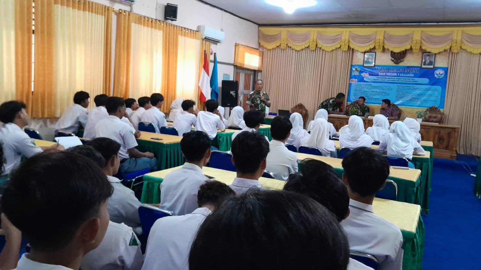 Dalam sambutannya, Kepala SMA Negeri 1 Ulujami Cahyono, S.Pd., M.Si. menyampaikan apresiasi dan ucapan terima kasih kepada Danramil 05/Ulujami beserta jajaran atas kehadirannya dalam rangka memberikan sosialisasi penerimaan prajurit TNI AD. Ia berharap kegiatan tersebut dapat memberikan manfaat positif bagi para siswa, khususnya dalam meningkatkan kedisiplinan, motivasi belajar, serta menumbuhkan rasa cinta tanah air dan semangat bela negara.