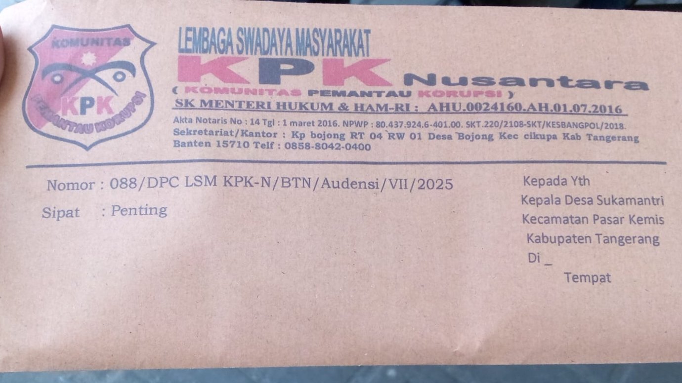 Mandala Nusantara News Tangerang, – Dalam mewujudkan tata kelola pemerintah desa dengan transparan, LSM KPK Nusantara yang sebelumnya melayangkan surat konfirmasi klarifikasi terkait dugaan penyalahgunaan anggaran, akan tetapi tidak mendapatkan respon. Kini LSM KPK Nusantara melayangkan surat audiensi terhadap pemerintah desa Sukamantri, kecamatan Pasar Kemis, kabupaten Tangerang, Senin (21/7/2025).