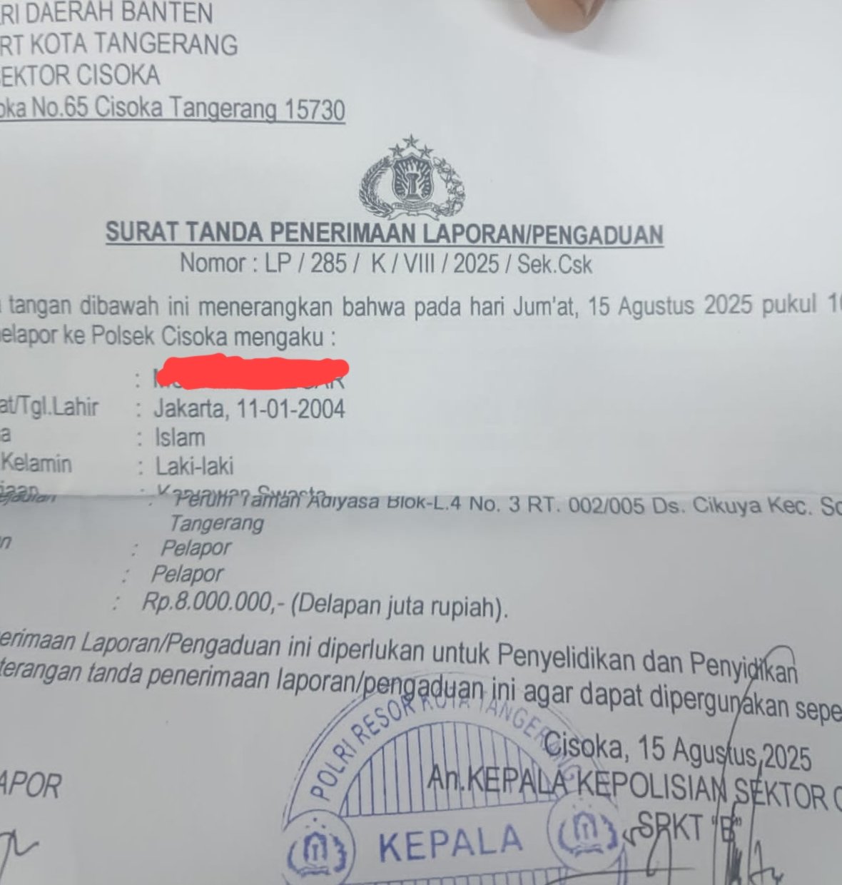 Menurut MT kejadian kehilangan motor nya tersebut pada Jum’at dua Minggu yang lalu kemudian di keesokan harinya(15/8) dia membuat laporan di kantor Polsek Cisoka bernomor : LP/285/K/VIII/2025/Sek.Csk dengan harapan pihak kepolisian dapat membantu mencarikan motor nya yang hilang.
