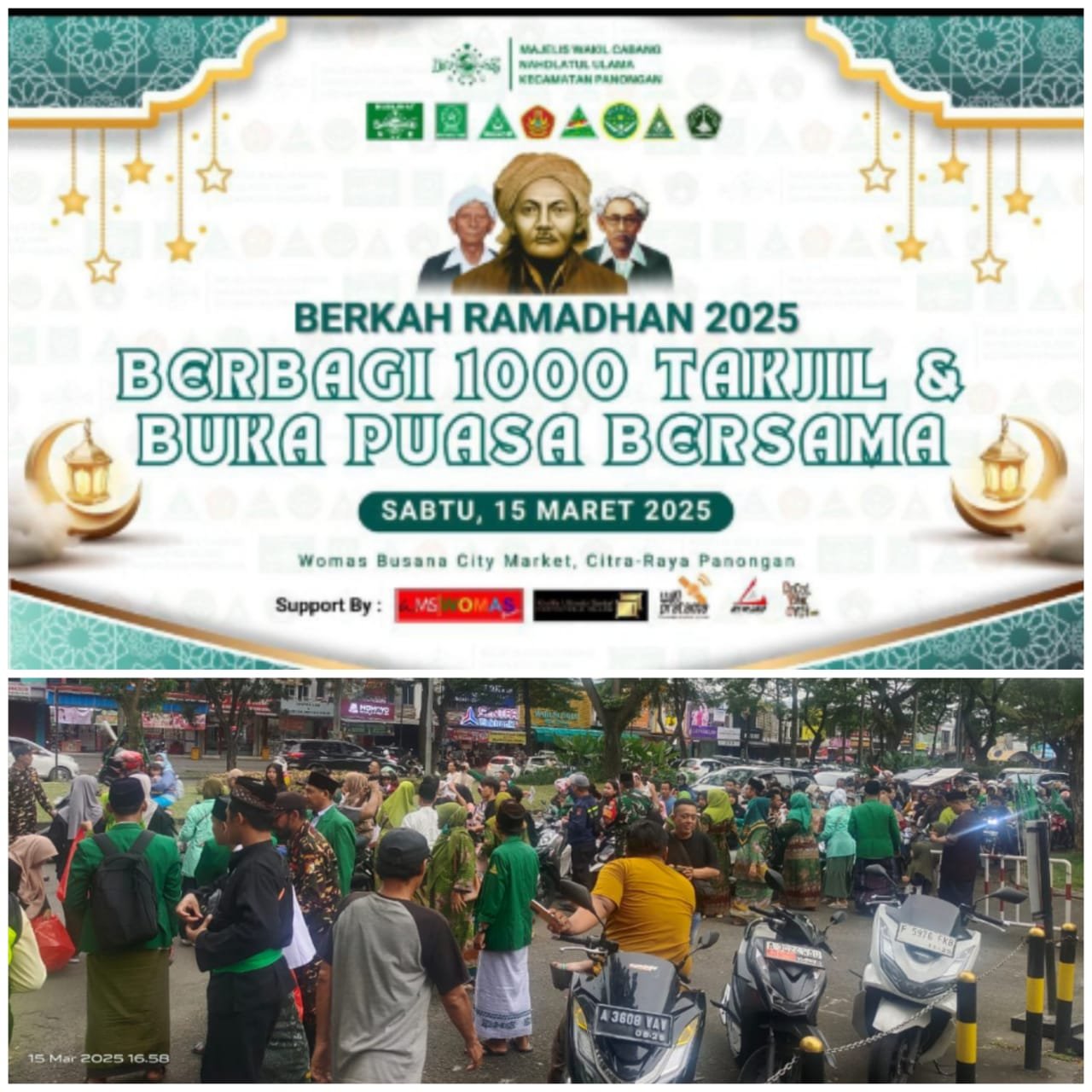 Tangerang Mandala Nusantara News – Majelis Wakil Cabang Nahdlatul Ulama (MWCNU) Kecamatan Panongan, gelar buka puasa bersama dan bagikan 1000 takjil. Bertempat di City Market Citra Raya acara dihadiri oleh Ketua (MWCNU) KH. Derajat Muhtadi, Ketua Pelaksana Ust. Heri Septiana dan Ketua GP Ansor Panongan Dede Khaeri, hadir pula undangan dalam acara tersebut, yaitu Ketua KPU Kab. Tangerang, Umar sebagai Ketua Demisioner GP Ansor Kec. Panongan, Ketua MUI Kec. Panongan, Perwakilan Kapolsek Panongan dan Koramil Panongan.” Sabtu 15 Maret 2025