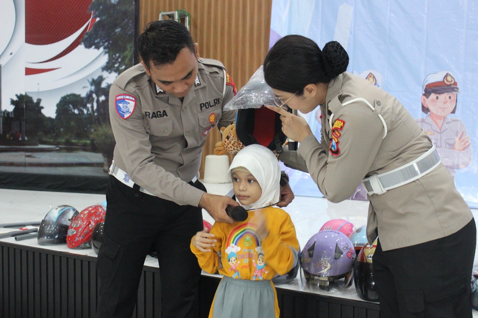 Bahkan untuk menambah semangat peserta belajar mengenal peraturan tertib lalu lintas, anggota Satlantas Polresta Sidoarjo juga mengajak mereka bermain, bernyanyi serta dibagikan helm dan tas sekolah.