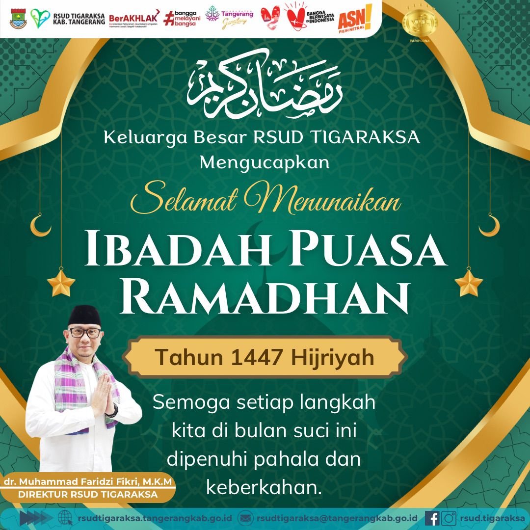 ”Keluarga besar RSUD Tigaraksa mengucapkan Marhaban ya Ramadhan, selamat menunaikan ibadah puasa 1447 H. Semoga amal ibadah kita diterima oleh Allah SWT dan kita senantiasa diberikan kesehatan lahir serta batin,” ujarnya dr. Faridzi
