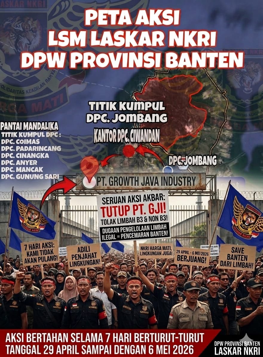 Hal tersebut di picu oleh Pencemaran Lingkungan di duga timbul dari Aktifitas PT Growth java Industri (GJI), hingga menuai seruan Aksi Laskar NKRI menegaskan tuntutan utama yakni penutupan PT GJI serta penolakan terhadap limbah B3 maupun non-B3 yang dinilai merusak lingkungan di wilayah Banten.