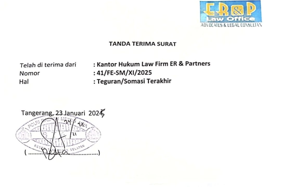 Somasi terakhir dengan Nomor 41/FE-SM/XI/2025, Tangerang, 24 November 2025 Kepolisian Republik Indonesia yang bertugas di Polres Tangerang Selatan Polda Metro Jaya, atas nama: IPDA Edi Tri Waluyo, S.H., dan AIPDA E. Winarto,S.H atas dugaan Perbuatan Melawan Hukum (PMH);