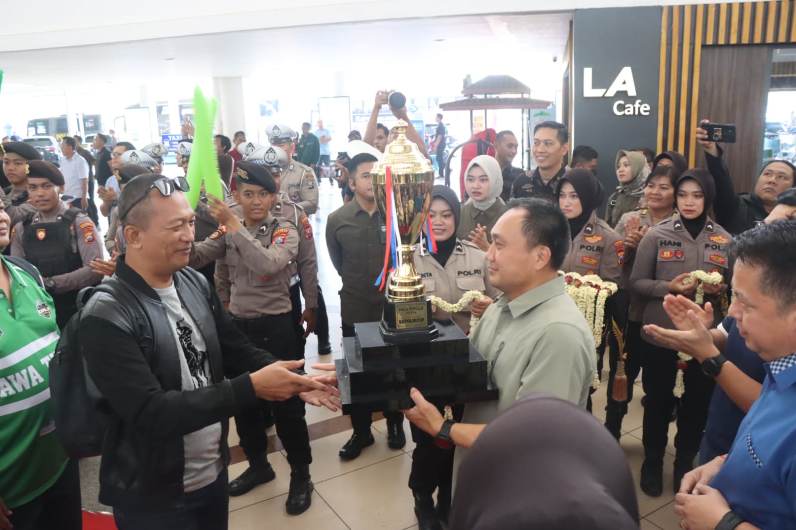 Kapolda Jatim Irjen Pol. Imam Sugianto dengan membawa Piala dari Kapolri dalam kejuaraan ini, tampak bangga atas peraihan prestasi tim bola voli putra-putri Polda Jatim yang juga didampingi Kapolresta Sidoarjo Kombes. Pol. Christian Tobing, atas keberhasilan tersebut, Wakapolda Jatim Brigien Pasma Royce dan Wakapolresta Sidoarjo AKBP Bayu Suta, menyambut langsung kedatangan tim voli putra dan putri di Bandara Juanda, Minggu (13/10/2024).
