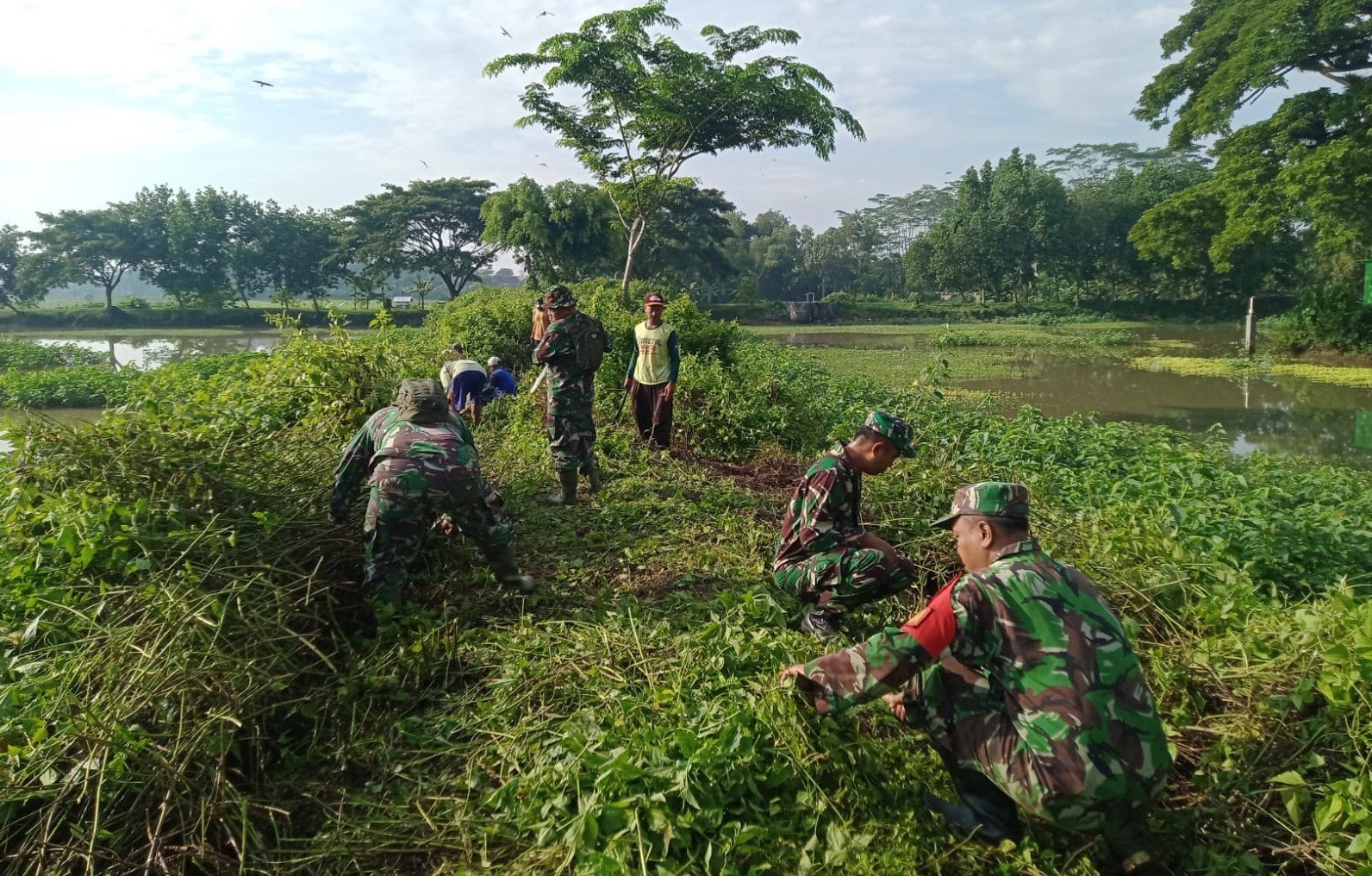 Berbekal alat sederhana seperti mesin pemotong rumput, sabit, dan cangkul, TNI dan warga bahu-membahu membersihkan semak belukar dan sampah yang menumpuk di sekitar embung. Pemandangan penuh semangat ini mencerminkan kekompakan dan kebersamaan dalam merawat lingkungan.