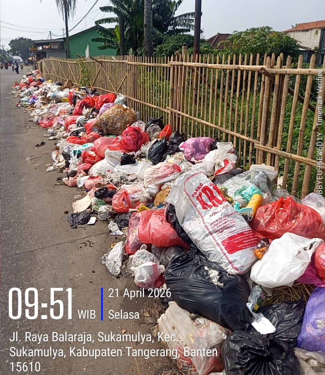 Mandala Nusantara News, TANGERANG – Tumpukan sampah yang menggunung di Jalan Raya Kresek, tepatnya di Desa Sukamulya, Kecamatan Sukamulya, Kabupaten Tangerang, kian memprihatinkan. Selain merusak pemandangan, bau menyengat yang ditimbulkan juga mengganggu kenyamanan para pengguna jalan dan warga sekitar, Selasa (21/4/2026).
