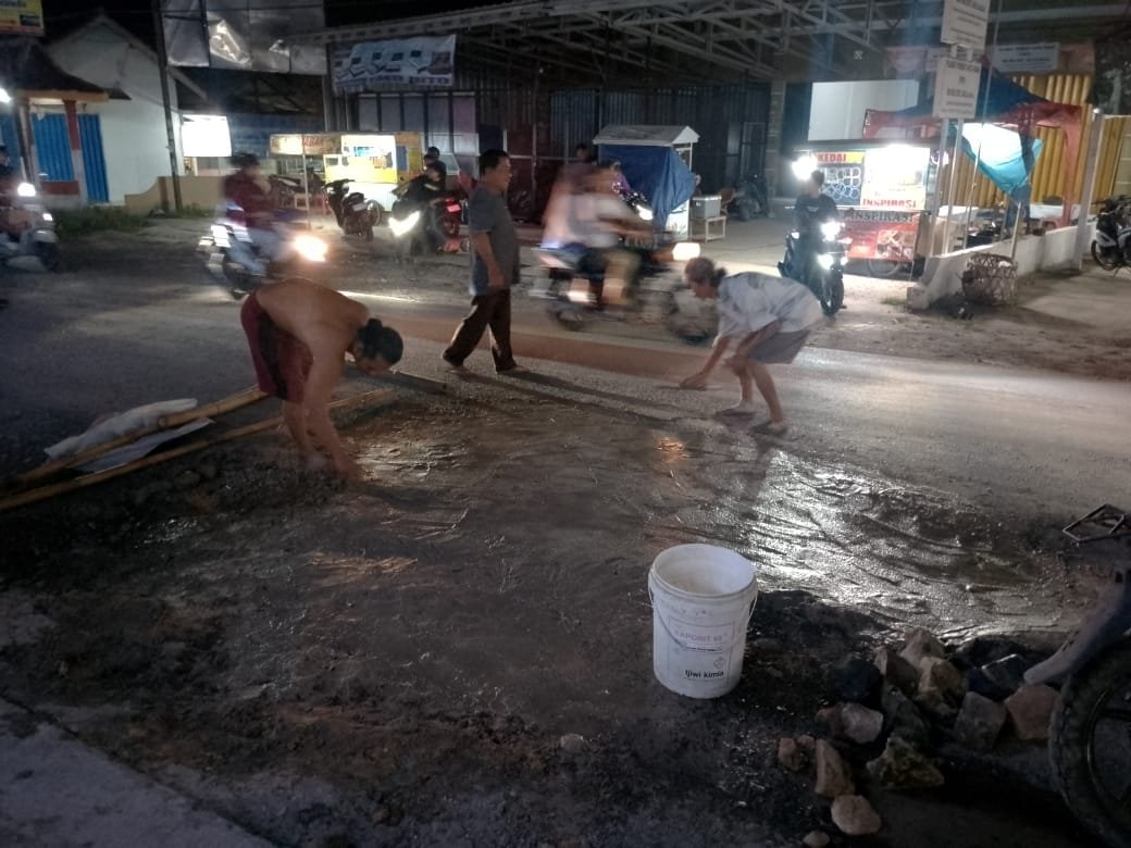 Warga Desa Sidodadi, RT 03 Ringin Agung 1, Kecamatan Sidomulyo, Kabupaten Lampung Selatan, bersama sejumlah relawan kembali melakukan aksi gotong royong memperbaiki jalan berlubang di Jalan Perintis Kemerdekaan, tepatnya di depan Bank Lampung Sidomulyo, pada Minggu malam (27/12/2024).
